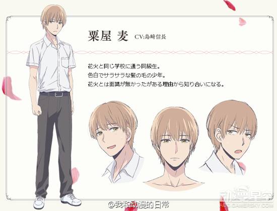 Mugi Awaya (粟屋 麦) Another high school student who is in love with the music teacher Akane (Source Wikipedia) Voice Actors Shimazaki, Nobunaga Japanese Kreuer, 粟屋麦とは幼なじみかつ恋心を抱いている。 また安良岡花火との関係には大反対で、彼女のことをひどく嫌っている。 via google imghp この6人を見ただけでも、恋愛関係がぐちゃぐちゃに入り混じっているのがわかりますね。 粟屋 麦(cv:島﨑信長) 花火と同じ学校に通う同級生。色白でサラサラな髪の毛の少年。花火とは面識がなかったがある理由から知り合いになる。 絵鳩早苗(cv:戸松 遥) 花火の友人。1年生のときは花火とはクラスメイトだった。